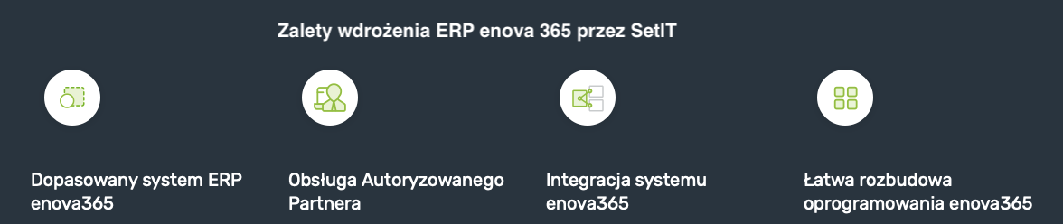 Jako SetIT, autoryzowany partner systemu enova365, jesteśmy ekspertami w dziedzinie optymalizacji i usprawniania procesów biznesowych. Dzięki naszemu doświadczeniu pomożemy w przeanalizowaniu Twoich potrzeb. Podczas bezpłatnej prezentacji przedstawimy korzyści, jakie zapewni Twojej firmie wdrożenie ERP enova365. Spotkanie może odbyć się u Ciebie lub online – Ty decydujesz!